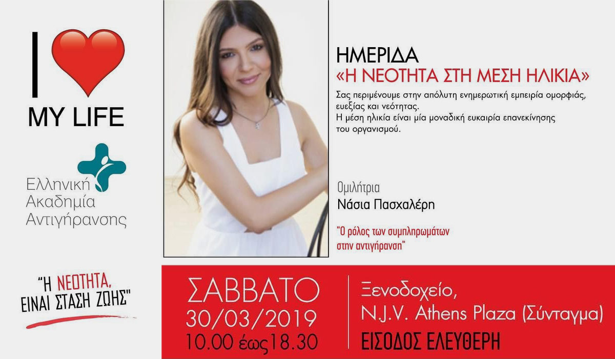 Αύριο σας περιμένουμε για να μάθετε πως θα παραμείνετε νέοι στη μέση ηλικία! Η Νάσια Πασχαλέρη θα μιλήσει για το ρόλο των συμπληρωμάτων στην αντιγήρανση,στις 15:00-16:00! Να είστε εκεί!
